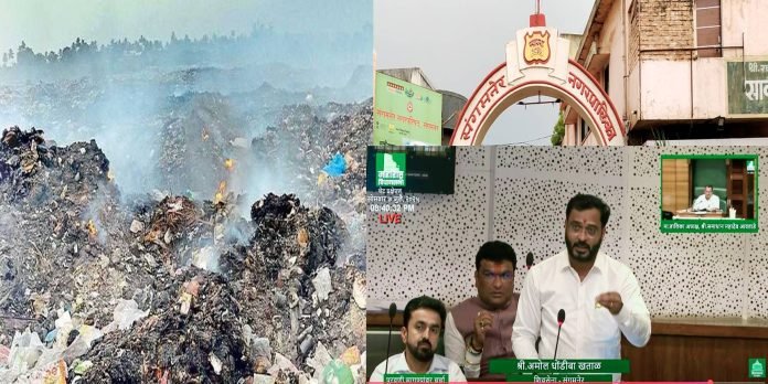 संगमनेर : संगमनेर खुर्द परिसरातील कचरा डेपोला आग लागल्यामुळे मोठ्या प्रमाणात वायू प्रदूषण होत आहे. वाढते वायु प्रदूषण आटोक्यात आणण्यासाठी व स्थानिक नागरिकांचे आरोग्य धोक्यात येऊ नये, यासाठी नगरविकास खात्या मार्फत काय प्रतिबंधात्मक उपाययोजना केली? असा सवाल आमदार अमोल खताळ यांनी विधानसभेत केला आहे. तसेच या कचऱ्यामुळे नागरिकांचे आरोग्य धोक्यात येऊ नये, यासाठी उपाययोजना कराव्यात, अशी मागणी आमदार अमोल खताळ यांनी विधानसभेत तारांकित प्रश्नाद्वारे केली आहे.