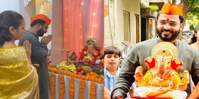 संगमनेर शहरातील घुलेवाडी रोडवरील आमदार अमोल खताळ यांच्या साईहर्ष या निवासस्थानी आमदार अमोल खताळ व त्यांच्या पत्नी नीलम खताळ यांच्या शुभहस्ते विधिवत पूजा आरती करून गणरायाची भक्तिमय वातावरणामध्ये प्रतिष्ठापना करण्यात आली. यावेळी त्यांचे वडील धोंडीबा खताळ,आई मंगल खताळ, भाऊ राहुल खताळ, भावजयी शीतल खताळ यांच्यासह खताळ परिवार उपस्थित होता.